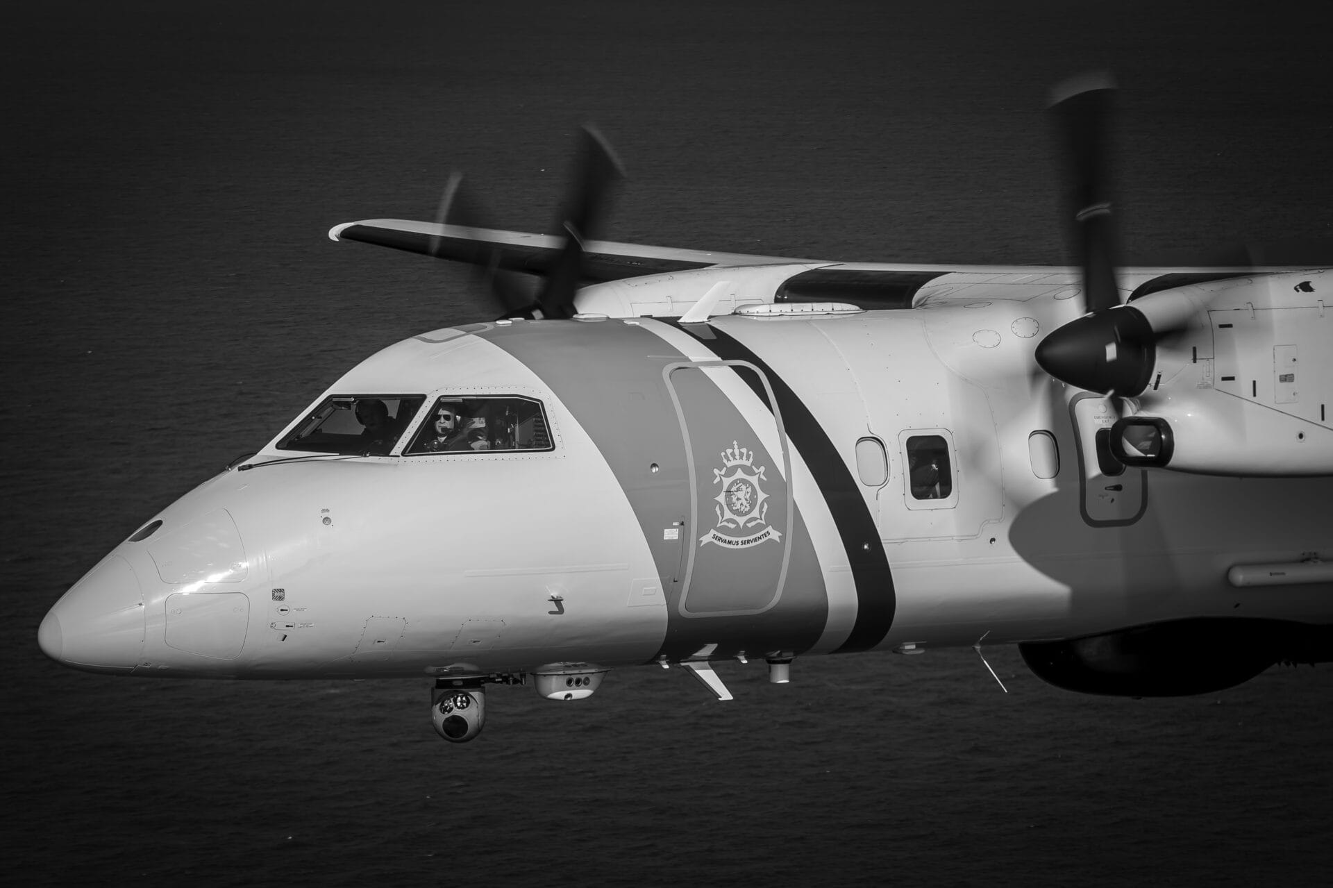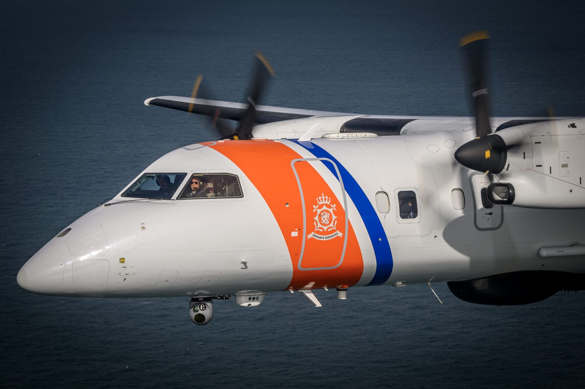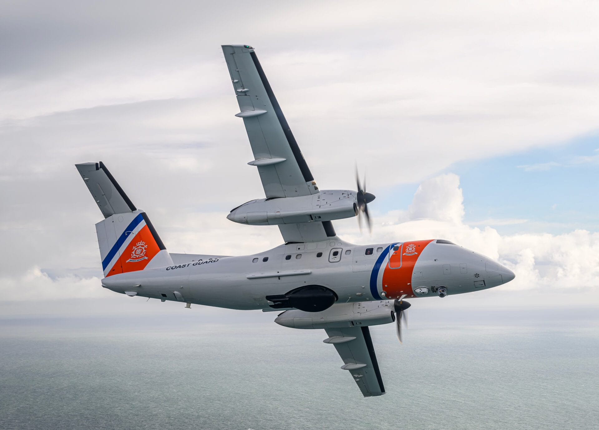 Unlike the legacy Dornier, which had a limited endurance of 4 hours, the Dash-8 can fly for 8 hours. Its pressurized cabin and operating capability allow crews to loiter at higher altitudes to monitor ships covertly while reducing fatigue.